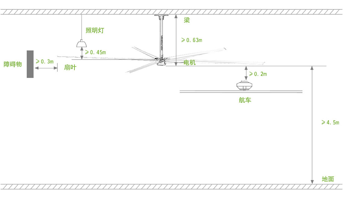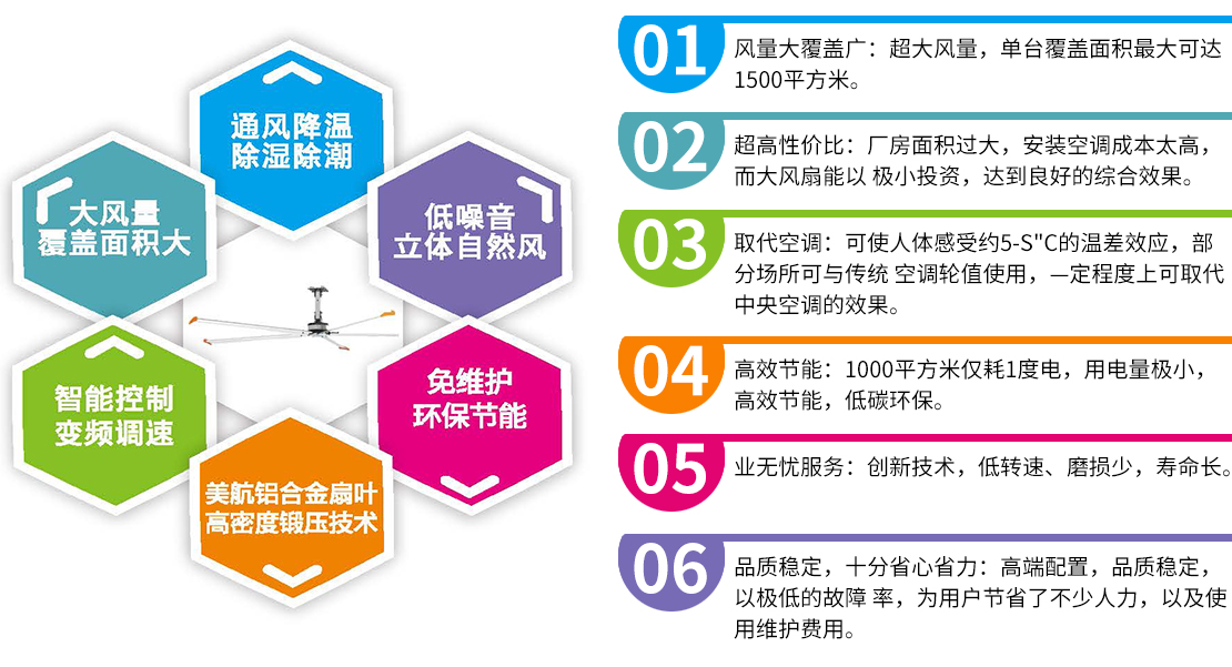 一台7.3米直径大风扇覆盖面积约等千50台直径750mm壁式/落地式风扇的覆盖面积、例如在一1500平方米厂房,需要安装直径750mm壁式/落地式风扇约50个,选择7.3米直径大风扇仅需1台,7.3米直径大型风扇年耗电2250KW, 直750mm壁式/落地式风扇耗电22550KW, 每年节约的电费成本数目惊人,节能效果非常明显。
